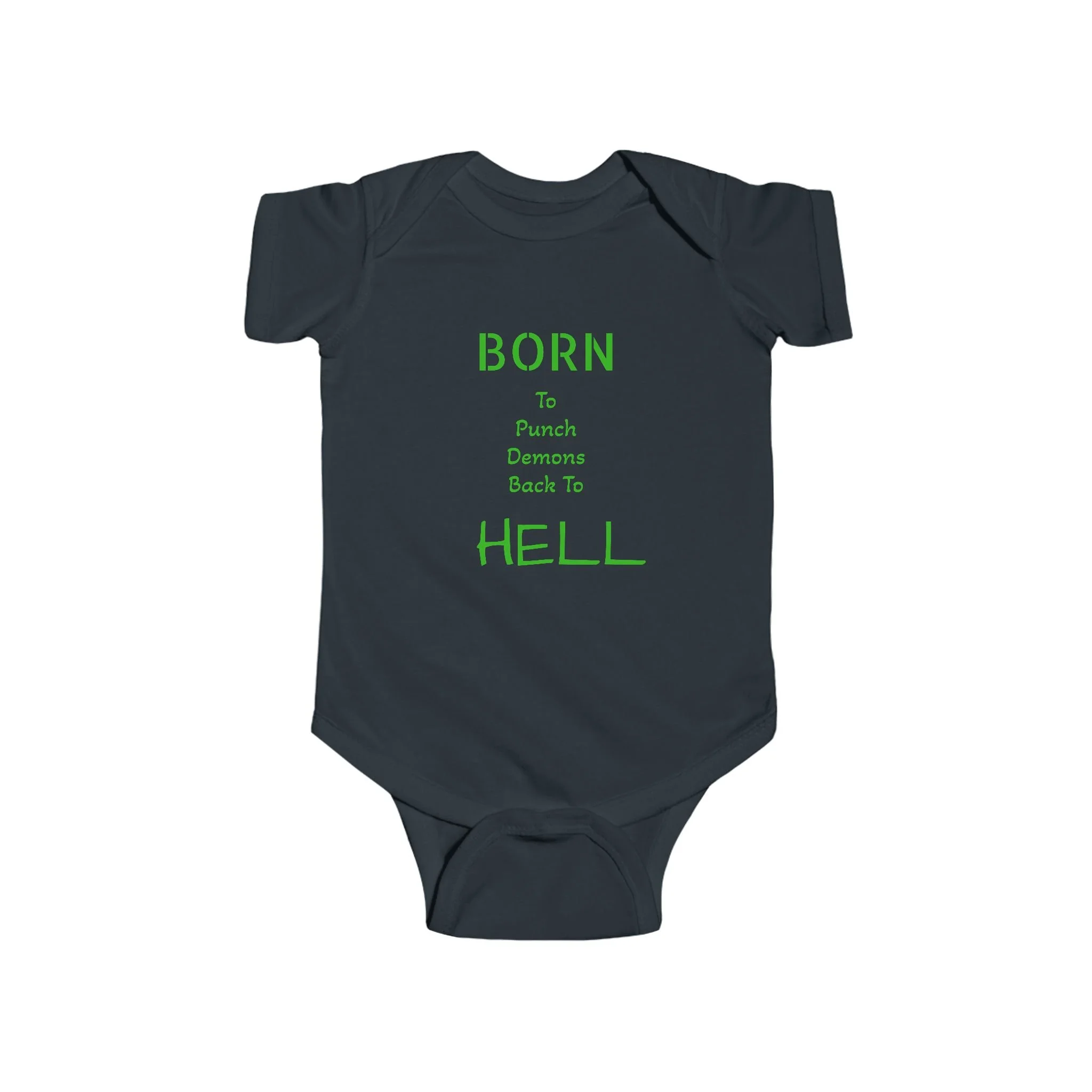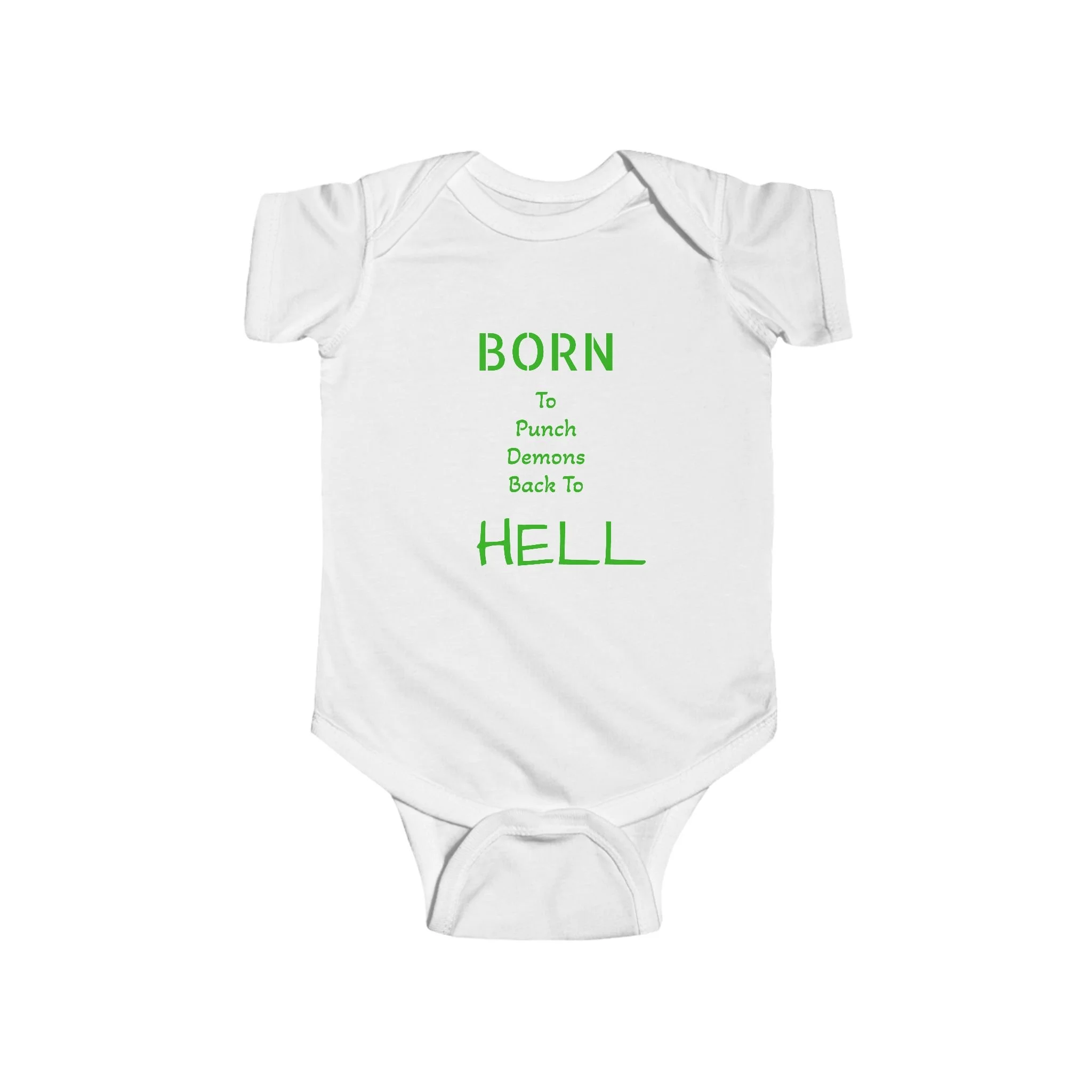 Born to Punch Demons Back to Hell Bodysuit | Green Demon Logo Infant Onesie