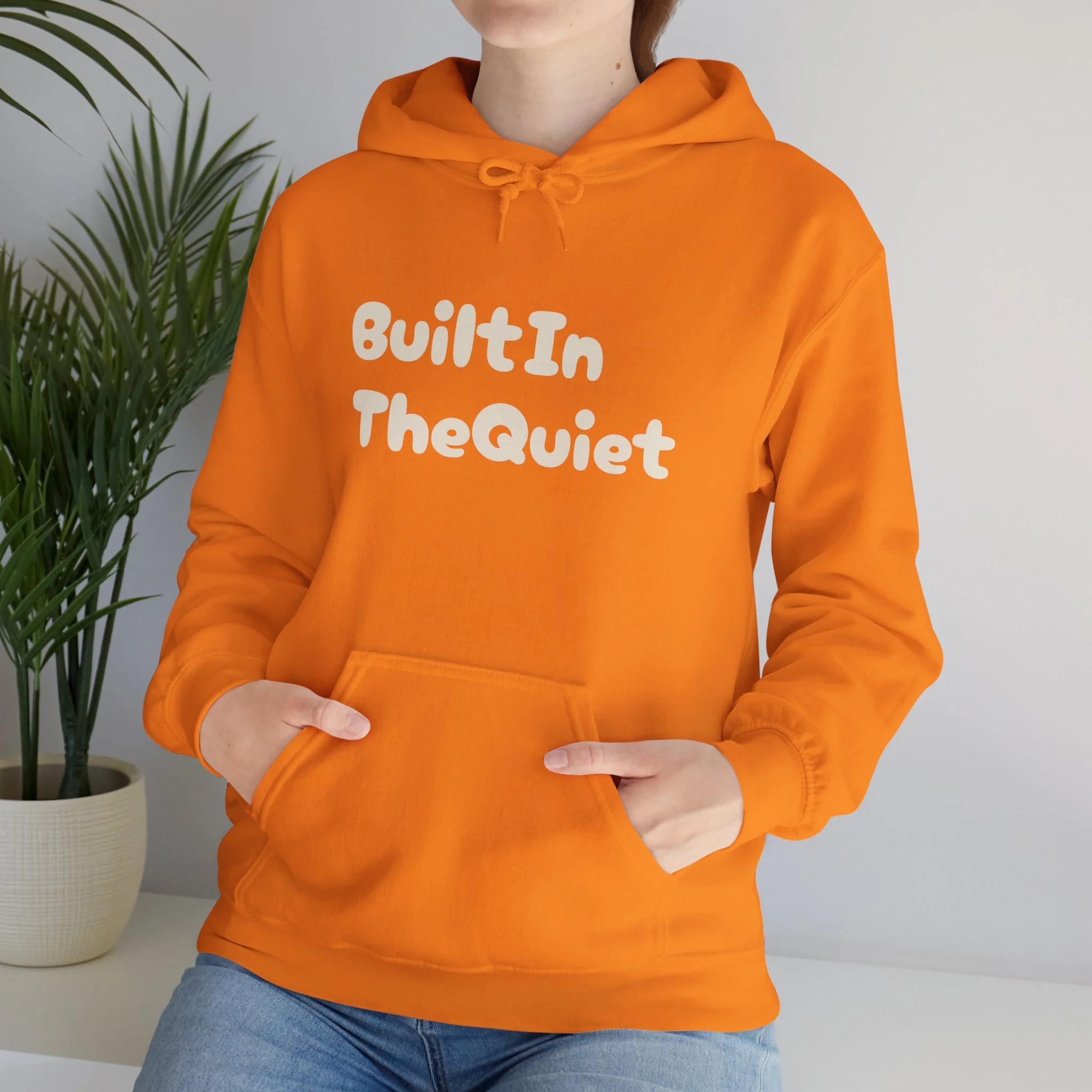 A cozy, softly structured hoodie that reads like an inside thought — steady, confident and quietly bold. The front displays a warm, rounded type that says “BuiltIn TheQuiet,” while a subtle, slim logo rests near the upper back. Wear it when you want calm energy: mornings with coffee, late-night studio sessions, or slow walks through town. The roomy kangaroo pocket and double-lined hood keep you comfortable and sheltered. It’s made from a durable cotton/poly blend that holds prints and embroidery well, and the tear-away label keeps the neckline scratch-free. This hoodie slips into everyday life for people who value quiet strength and low-key style.