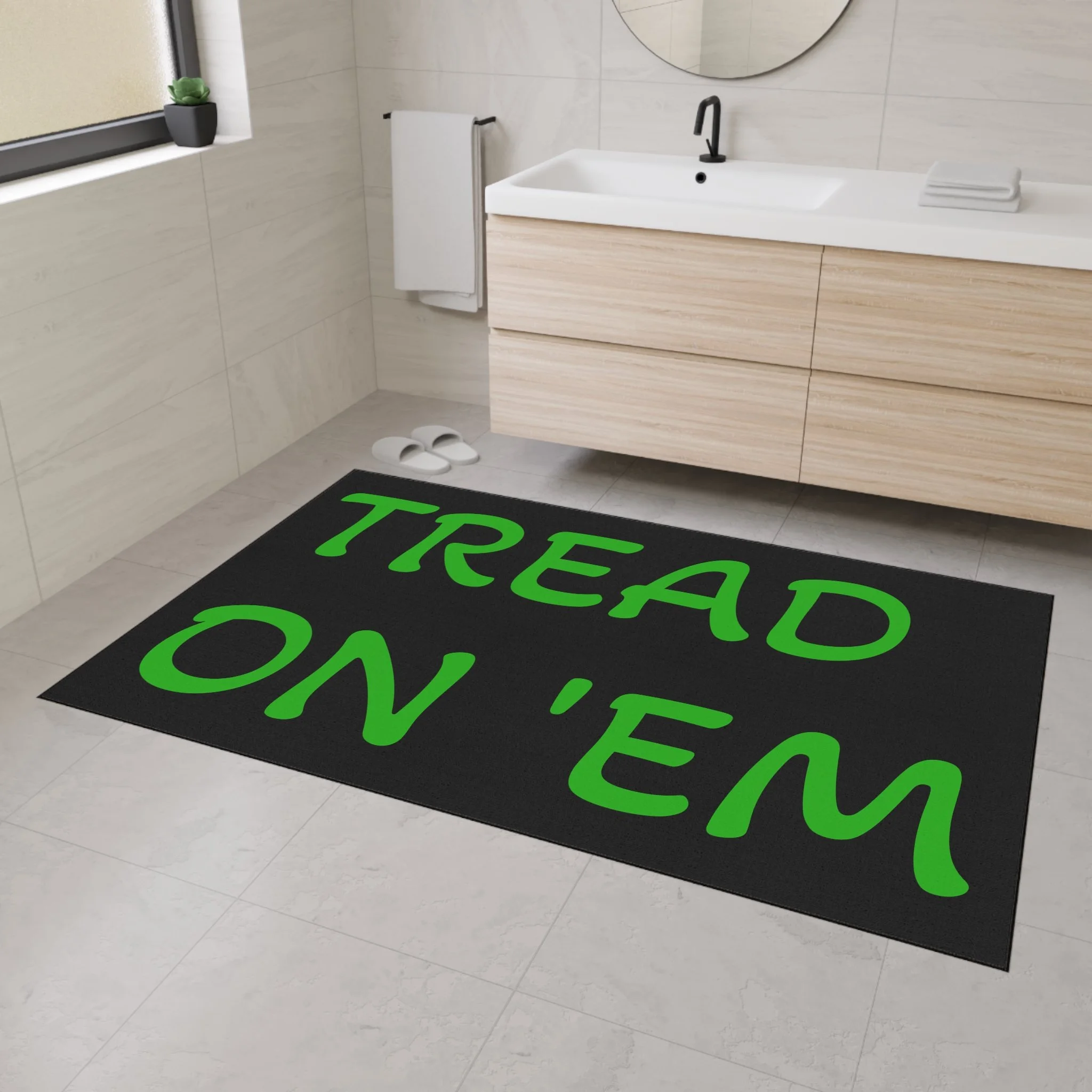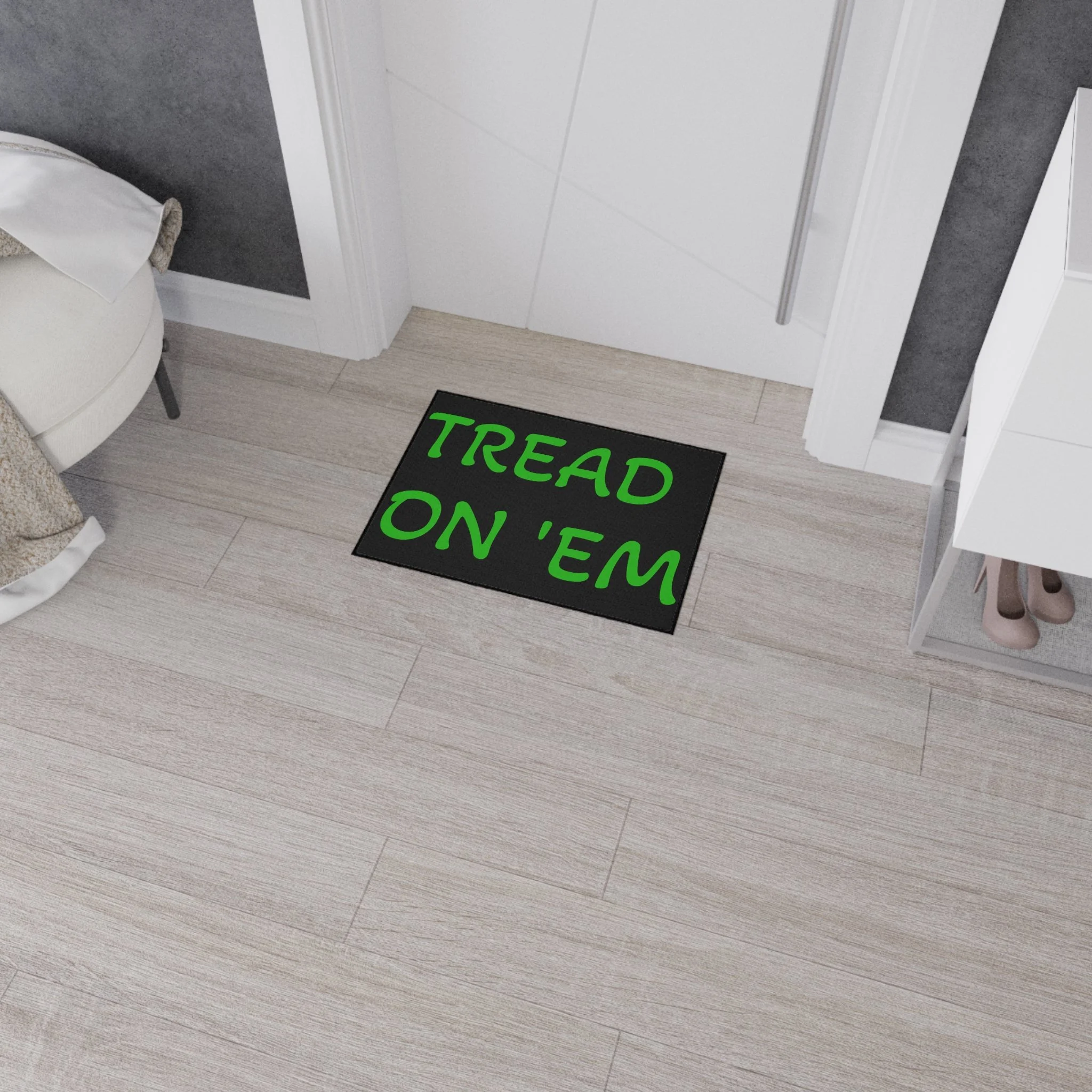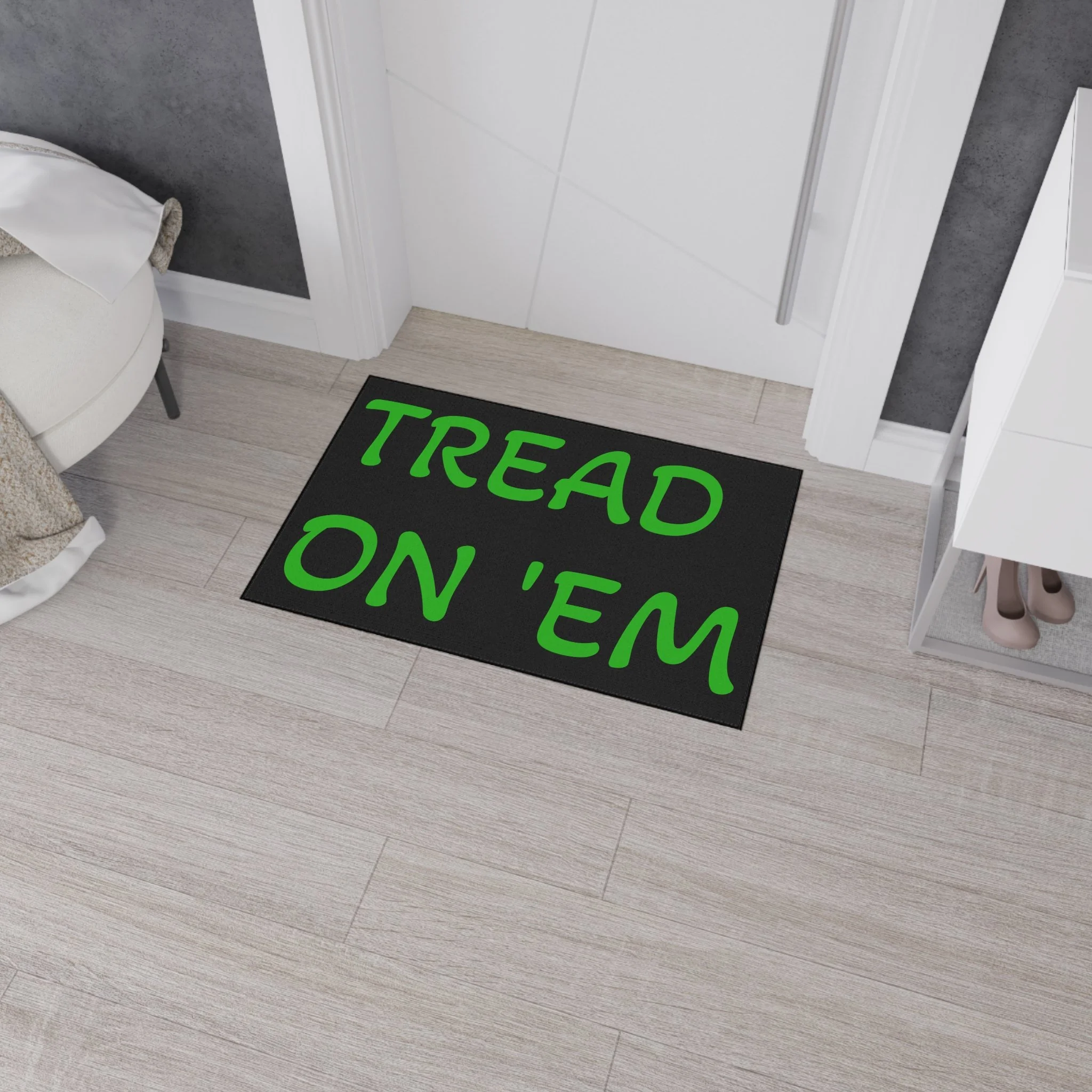 Step onto a mat that speaks plainly. This heavy-duty floor mat brings bold, unapologetic typography and hard-wearing construction to your entryway or mudroom. The high-contrast black text on a clean white field reads like a wink—no frills, just attitude—while the durable polyester surface resists wear and the rubber backing stays put through boots, pets, and busy days. Finished with a black trim and one-sided print, it slips seamlessly into a minimalist, industrial, or rustic space and adds a little character to everyday comings and goings. Assembled in the USA from globally sourced parts, it’s built to handle traffic without fuss.