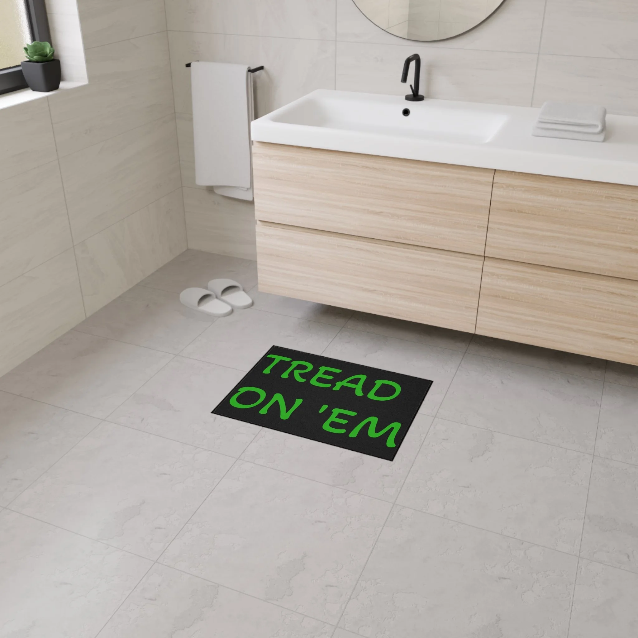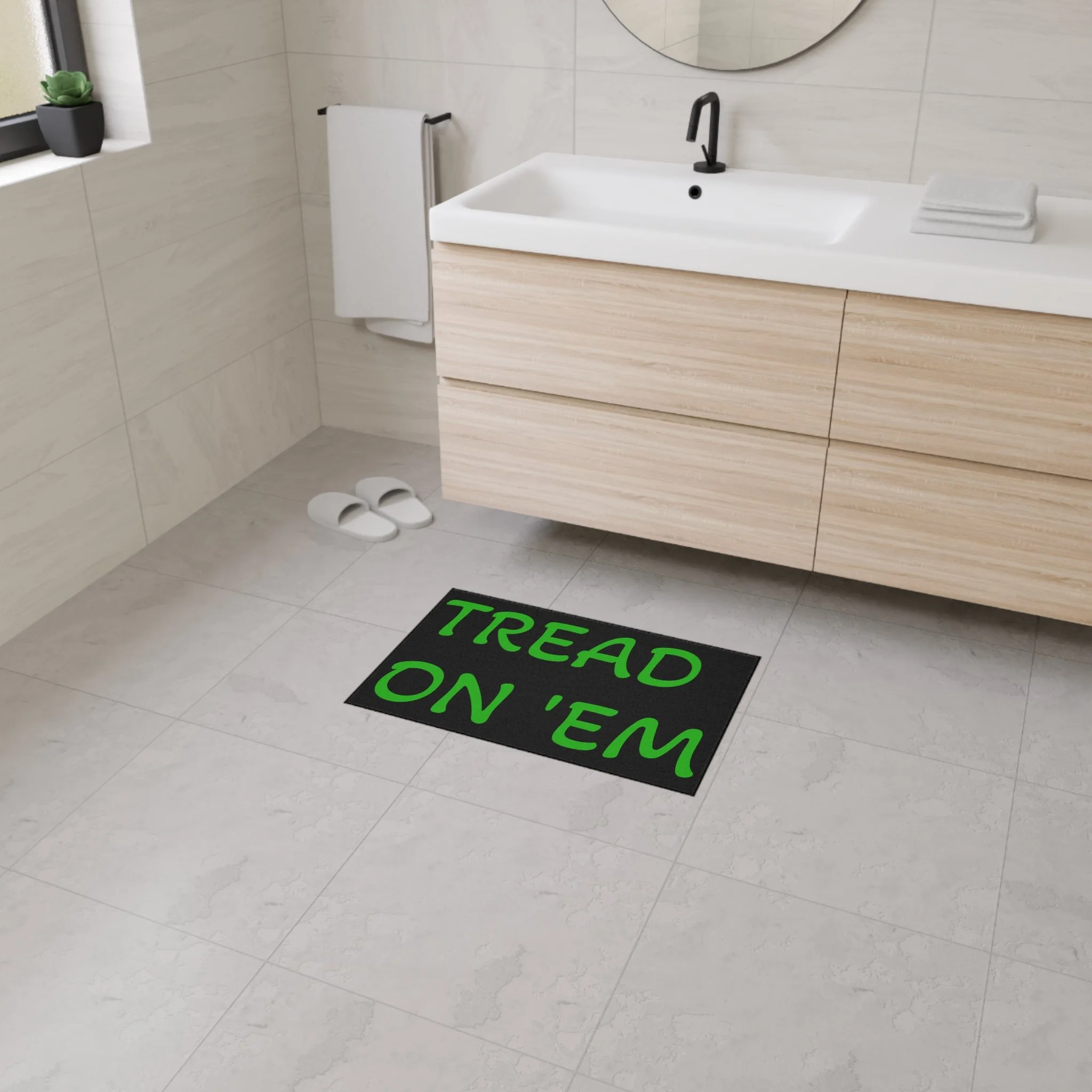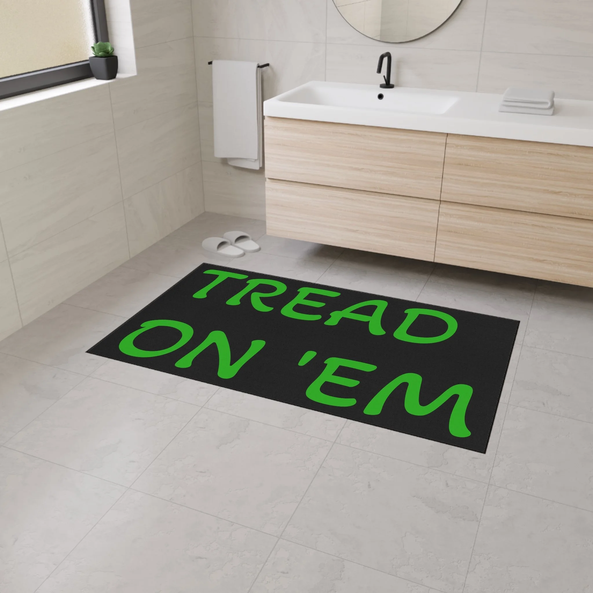 Step onto a mat that speaks plainly. This heavy-duty floor mat brings bold, unapologetic typography and hard-wearing construction to your entryway or mudroom. The high-contrast black text on a clean white field reads like a wink—no frills, just attitude—while the durable polyester surface resists wear and the rubber backing stays put through boots, pets, and busy days. Finished with a black trim and one-sided print, it slips seamlessly into a minimalist, industrial, or rustic space and adds a little character to everyday comings and goings. Assembled in the USA from globally sourced parts, it’s built to handle traffic without fuss.