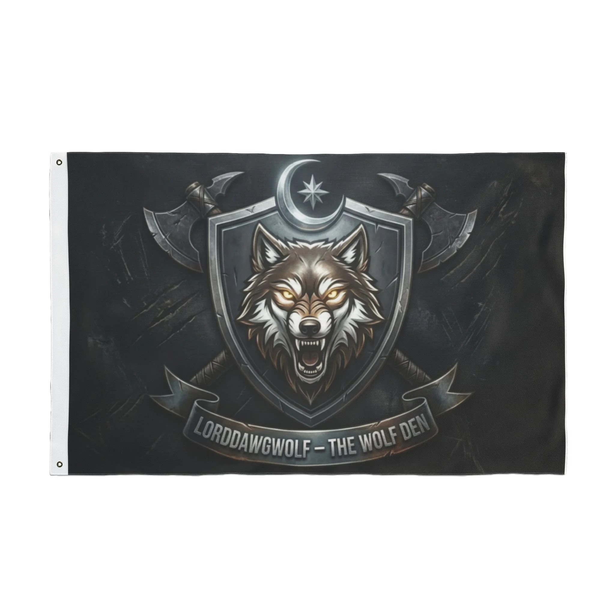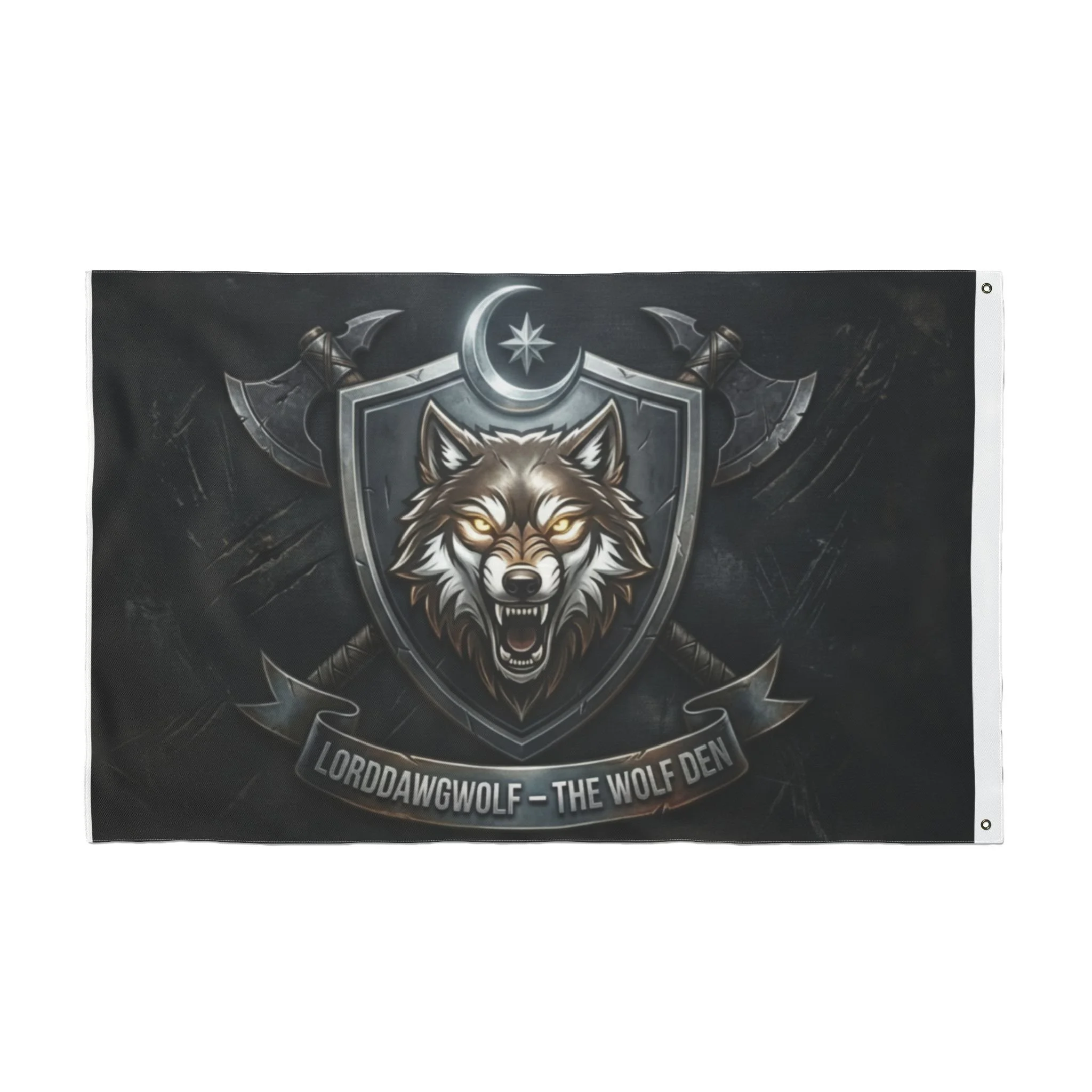 A bold, double-sided polyester flag that brings a fierce, medieval-meets-gaming energy to any space. The snarling wolf crest, crescent emblem, and crossed axes read like a clan banner — dark, weathered, and full of character. Lightweight and durable, it swings cleanly on a pole or hangs flat on a wall, instantly turning a room into a den for game nights, streams, or personal workspace. The vibrant, double-sided print keeps the design striking from either side, while reinforced metal grommets make mounting simple and secure. Hang it in a streaming backdrop, over a desk, or at a tabletop battle to anchor the mood and show allegiance.